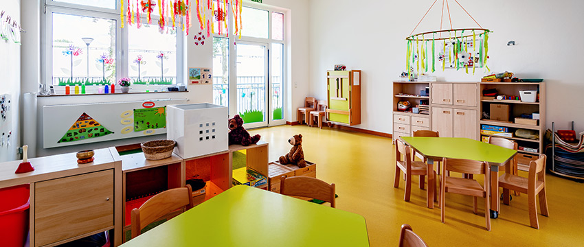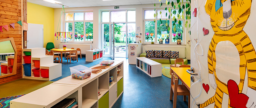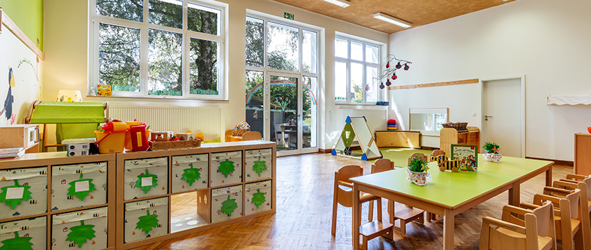 Feste Gruppen, eigener Schlafraum und Sporthalle – Orte, an denen Kinder sich sicher fühlen, spielen und Neues ausprobieren können.