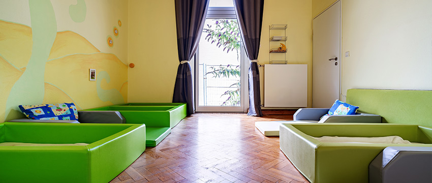 Unsere unter Dreijährigen halten ihren Mittagsschlaf in einem gemütlichen, eigenen Schlafraum. Jedes Kind hat dort sein persönliches Bettchen, in dem es zur Ruhe kommen, neue Kraft tanken und sich sicher und geborgen fühlen kann.