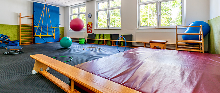 Die Turnhalle auf der gleichen Etage bietet zusätzlichen Raum für Bewegung und Spaß.